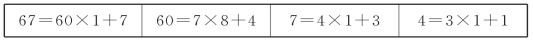 互素整数对67和60辗转相除,得到有自然余数1的(1d):4(a或r2)=3(b或r3)×1+1,即记作a=mb+1。