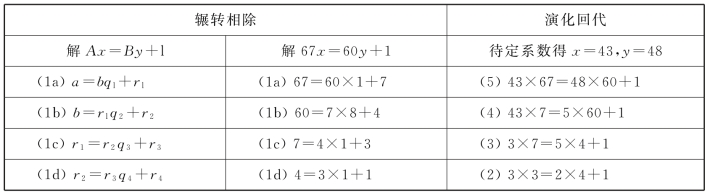 两系数67和60,辗转相除,得到四个带余除法,余数分别是7,4,3和1。对最后一个带余除法4=3×1+1,常数为1。巴歇设计了一个转换公式:“a=mb+1,那么ab+l-a是b的最小倍数,比a的倍数多1”,得到3×3=2×4+1。以此为基础,从辗转相除式中,反向消去余数3,4,7,要避免负数。