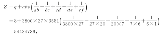 数例一 为利于比较,选用黄宗宪演算过的秦九韶“推计土功”题,从衍数3800和甲定27得到乘率23的两个互素模a=3800,b=27,即有a>b,[a,b]=102600。再任取一数56789作Z来核算。56789=14×3800+3589=2103×27+8,于是p=3589,q=8,v=p-q=3589-8=3581。用求a,b最大公因数的方法,把a,b辗转相除,求余数序列:a÷b=3800÷27,余20,令c=20;b÷c=27÷20,余7,令d=7;c÷d=20÷7,余6,令e=6;d÷e=7÷6,余1,令f=1。检查知,余数序列c,d,e,f,…中,只有f=1能整除v=3581,因此,括号中取5项,