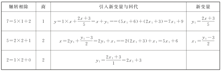 这个过程等价于求5和7最大公约数的过程,求出自然余数1和余数0(表9.1)。这里着重分析引入新变量的作用。