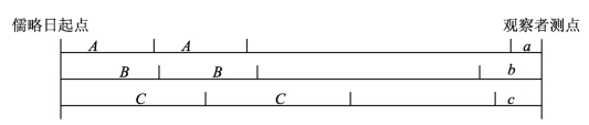 高斯所提到的年序学观察示意图(图10.1),以小纪(A)、黄金数(B)和太阳循环周期(C)三个周期,分别度量起点到观察者测点的总时间段。三个周期的乘积15×19×28=7980年为儒略周期。