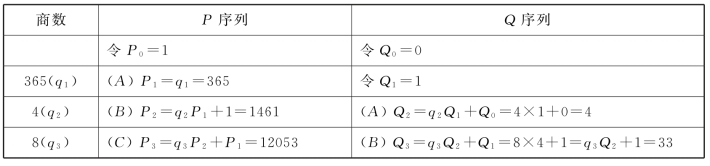 首项A取首商(q1)。因令P0=1,P1=q1=365这项对应于(q1),记A。其后,代入P0=1后的第二项P2=q2P1+P0=q2P1+1,记B。第二项中出现加1。