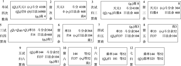 首除法6172608(岁率)=16900(日法)×365+4108(斗分)的4108(斗分)为r1,置首图右上。