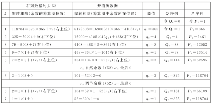 表11.4中左起纵一列是约简后的互素整数对。左起纵二列,才是采用的开禧历原数据。