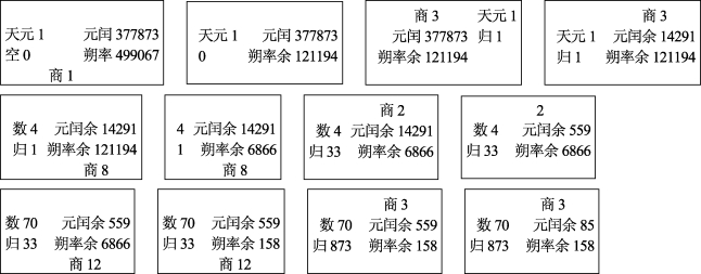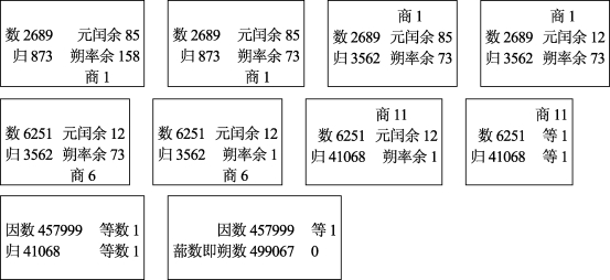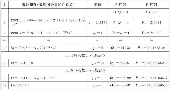 类似地,我们为1247年秦九韶自行设计的改良图,补入120365856000,形成120365856000=499067×241181+377873,即120365856000和499067互素,参见下图(图11.2)。