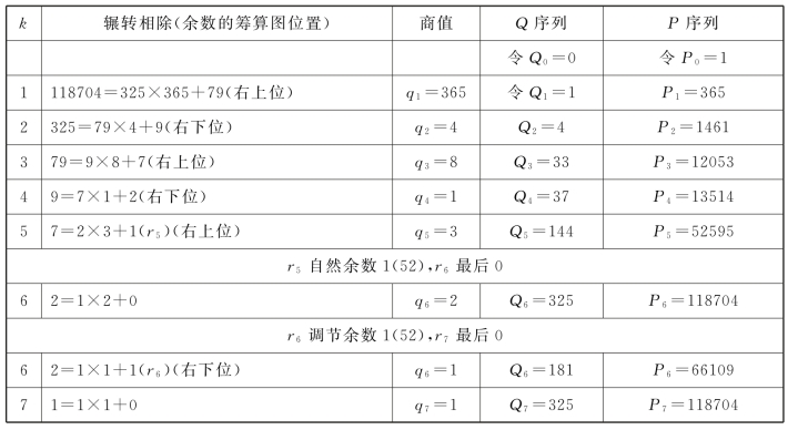 在开禧历求乘率原图中,我们约去52,取奇序整数对118704,325,用序列值解法(表11.7)。