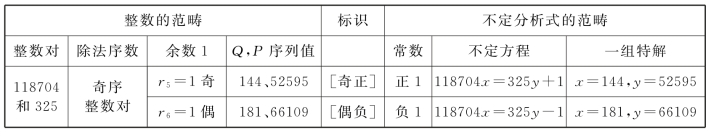 自然余数1(r5)在右上位,所对应的序列值是Q5=144,P5=52595。知x=144和y=52595为常数1不定方程118704x=325y+1的一组特解。144是同余式118704x≡1(mod 325)的特解。核算:118704×144=325×52595+1(表11.8)。
