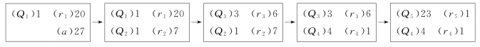 表11.9中,右下位的调节余数1(r5),所对应的序列值是Q5=23,P5=3237。知x=23和y=3237为常数为1的不定方程3800x=27y+1的一组特解。23是同余式3800x≡1(mod 27)的特解。核算:3800×23=27×3237+1。