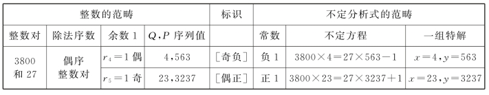 这个23称为对于整数对3800和27的乘率。这样,我们就能列出偶序整数对3800和27的两种不定方程可能解,见表11.10。