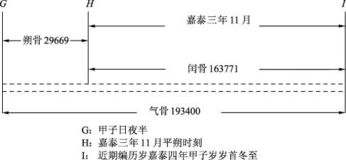 气骨193400减去朔骨29669,计算得闰骨163731,为11月平朔时刻到冬至点的时间间隔。气骨、朔骨、闰骨都是演纪积年的余数,特以骨取名,见图13.2。