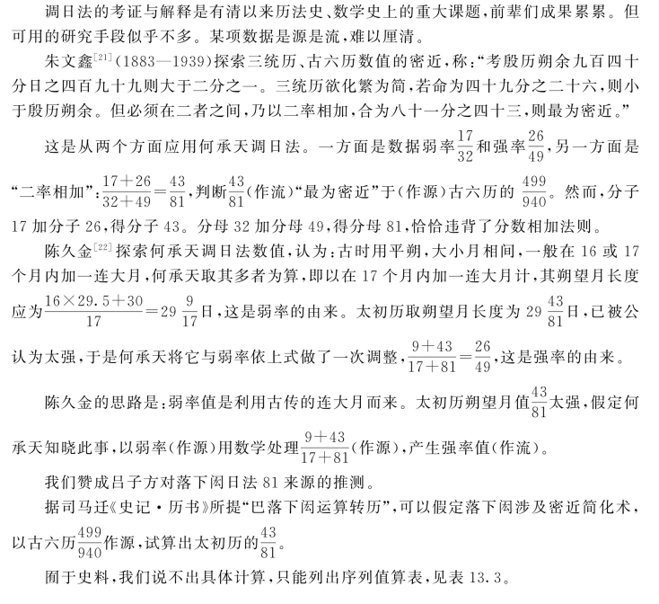 表13.3中第7次商(q7)1导出43与81,分母值81为3的倍数。如《汉书》所载“闳运算转历,其法以律起历”,当时人们对音律的认识,主要是三分损益律。太初历、三统历的历法数值,基本都与3有关。