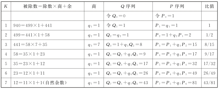 表13.3中第4次除法商1导出9与17之比,第6次除法商1导出26与49之比。