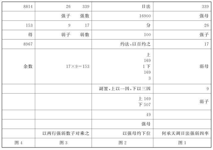 这组算图只能说是秦九韶调日法。列出强弱四率,再以强弱二率的分子互乘,得朔余,最后确定开禧历所取朔望月常数。事实上,朔策、朔余来自实测,绝不是调出来的。