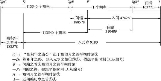 前面凭借气纪关系求出入元岁9180年。入元岁9180积累的岁闰,满朔率去之,不满474260称作入闰FI。起点F不是真正的平朔时刻②,为行文方便,称为假想平朔时刻。