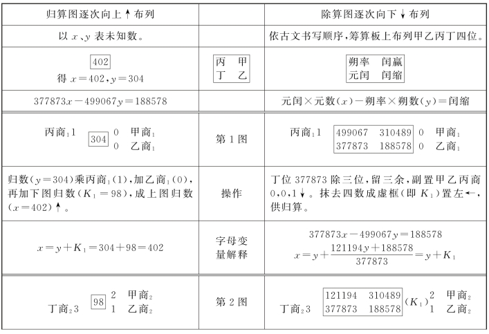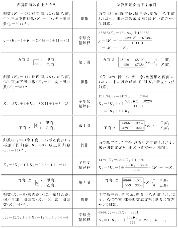 筹算板以框表示。抹去四数,留下的虚框,相当于引入现今的变量,便于以后的归算。各步商,副置在原数旁,以供归算。
