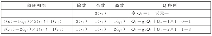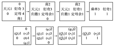 我们设想首除法为11(a)=2(q2)×4(b)+3(r1),首归算为令Q1=1,天元一。列出模仿11与4的序列计算,见表14.5。