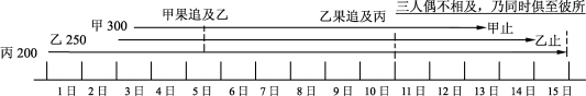 乙日行250里,行3000里,需要12天。乙于第3日卯初出发,行总行程3000里,只需12天,在第15日卯初,到达图中标“乙止”处。乙离3000里处,还要250里。
