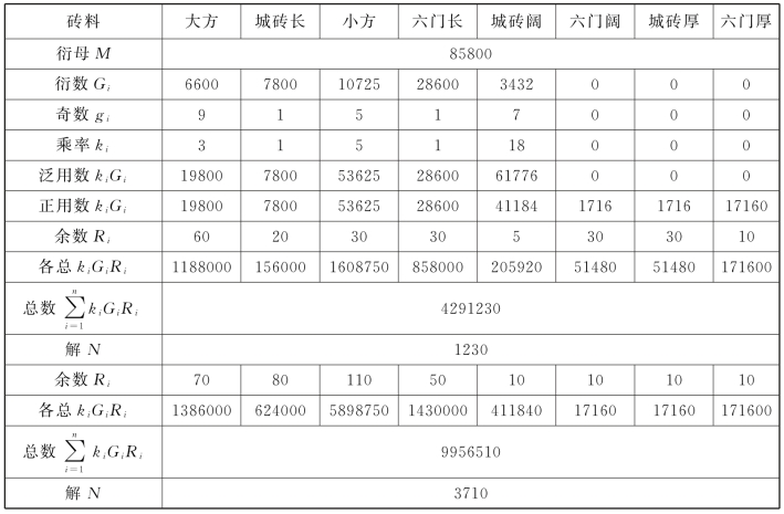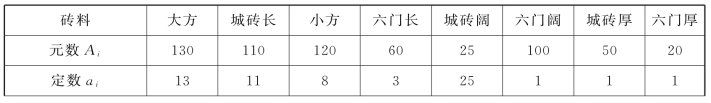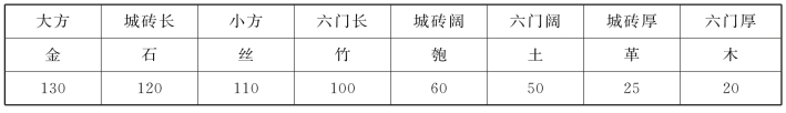 问欲砌基一段,见管大小方甎、六门、城甎四色。令匠取便,或平或侧,只用一色甎砌,须要适足。匠以甎量地计料,称用大方料,广多六寸,深少六寸。用小方:广多二寸,深少三寸。用城甎,长:广多三寸,深少一寸;以阔:深少一寸,广多三寸;以厚:广多五分,深多一寸。用六门甎,长:广多三寸,深多一寸;以阔:广多三寸,深多一寸;以厚:广多一寸,深多一寸。皆不合匝,未免修破甎料裨补。其四色甎,大方,方一尺三寸;小方,方一尺一寸;城甎,长一尺二寸,阔六寸,厚二寸五分;六门,长一尺,阔五寸,厚二寸。欲知基深广几何?