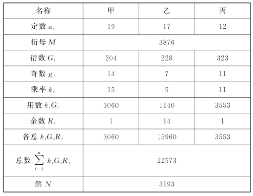 术曰:以大衍求之。列三器所容为元数,连环求等,约为定母。以相乘为衍母,以定各约衍母得衍数,各满定母去之,得奇。以奇定用大衍求得乘率,以乘衍数,得用数。次以各剩米乘用,并之为总。满衍母去之,不满为每箩米,各以剩米减之,余为甲乙丙盗米,并之为共失米。