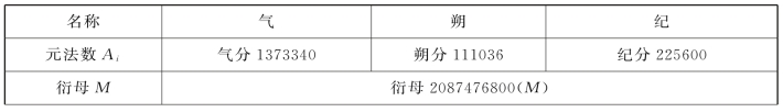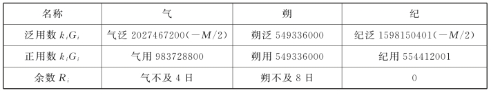 泛用图内,气泛2027467200,朔泛549336000,纪泛1598150401,各损衍母2087476800之半1043738400。得气正用得983728800,朔正用549336000,纪正用554412001。