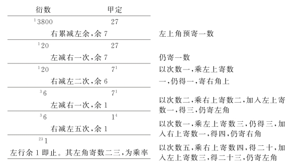 列定母于右行,列衍数于左行[左角上预寄一数],辗转累减[凡定母与衍数辗转累减,则其上所寄数,必辗转累加],至衍数余一即止,视左角上寄数为乘率[若求反乘率,至定母余一即止,视右角上寄数为反乘率]。