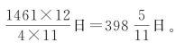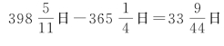 12年中,太阳12圈,岁星1圈。圈数之差11,12年11个交点,分成11个会合周期。12个岁实除以11个会合周期,就是会合周期长度。根据四分历岁实日,平摊得一会合周期