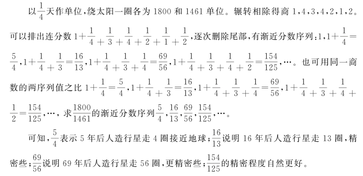 华罗庚的人造行星数例,帮助我们认识天度圈、日行一度、历数的实践意义和理论意义。正是天度圈圈数之比蕴含的巨大潜力,刺激出密近简化算法,更进一步刺激出大衍术求解满去式,算出上元积年。