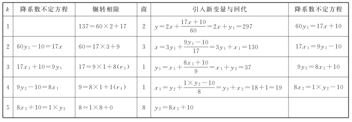 我们用欧拉的思路,试解137x+10=60y(表18.4)。两系数为偶序整数对,附加数10为正,恰巧与5y=7x+3是同一类型。