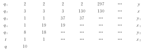 先看列。第三列为商5,2,1。第五列引入的新变量,都是形式上的分数、实质上的整数。整理新变量得第六列,为降系数不定方程2x+3=5y1,y1-3=2x1。第六列的降系数不定方程2x=5y1-3,y1=2x1+3,演变成第一列。