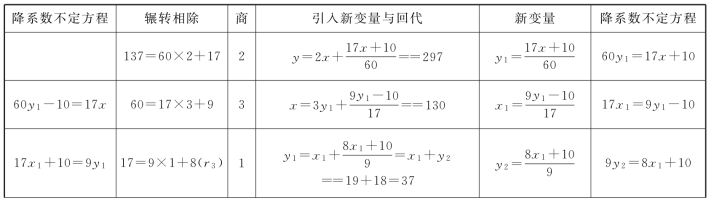 [注2:相当于把(I)137x=60y+10演化成为降系数不定方程60y1=17x+10(I.1)。]