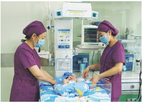 宕昌县人民医院新生儿重症监护病房护士细心照看新生儿。