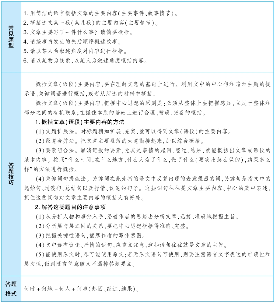 概括文章(语段)的主要内容,就是要弄清楚文章主要讲了什么,可分为概括整体/全文内容和概括局部/段落内容。概括文章内容时,需要抓住记叙文的“六要素”:时间、地点、人物,事情的起因、经过、结果。