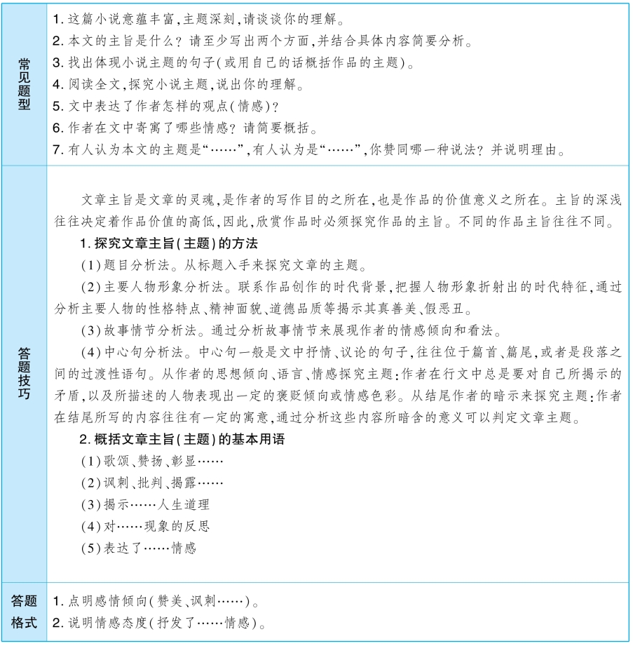 等)。可以通过分析标题,分析文中抒情句、议论句,分析背景等把握文章的主旨。在记叙文中,主旨与主题往往是相同的概念。