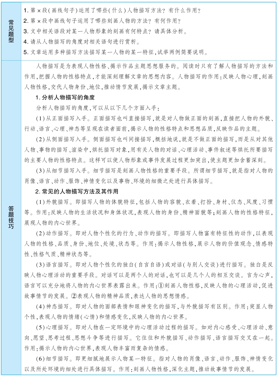 地表达文章的中心。常用的人物描写方法有:外貌描写(肖像描写)、动作描写、语言描写、神态描写、心理描写。