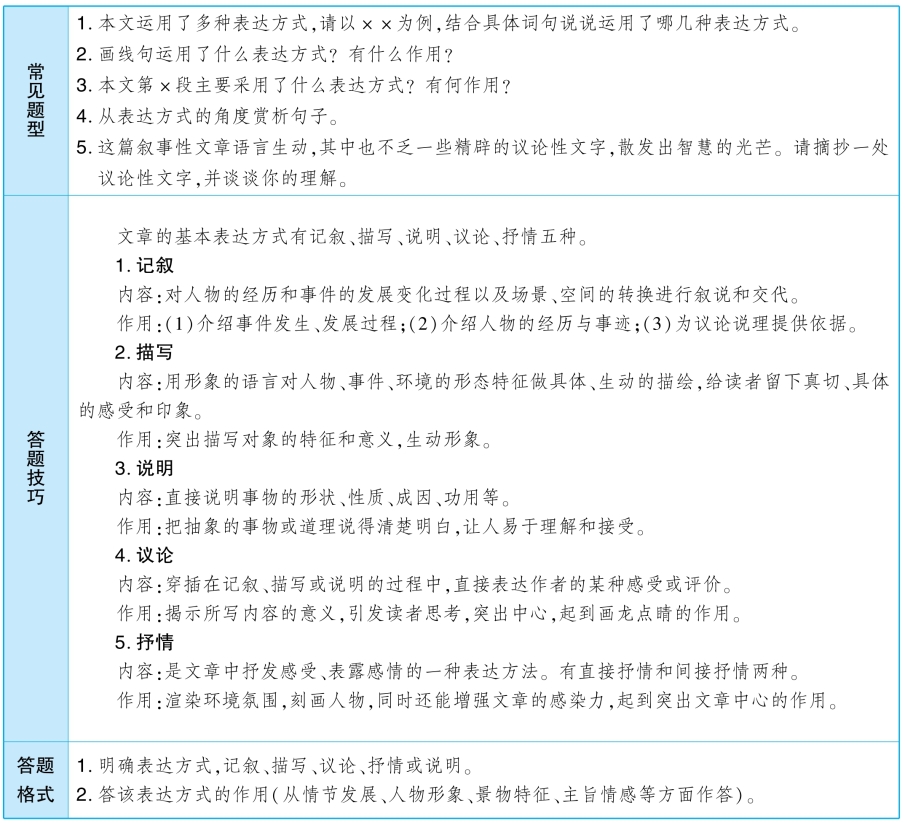 表达方式,通俗理解就是表述特定的内容所使用的一些特定的语言方法、手段。常见的表达方式有记叙、描写、说明、议论、抒情五种。
