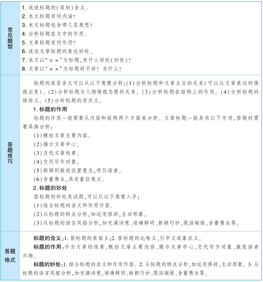 标题的含义一般从表层含义和深层含义两个方面来分析。表层含义即标题在文中的表面义和本义。深层含义即结合文章内容理解的引申义、比喻义、象征义。标题的作用一般需要从内容和结构两个方面来分析。