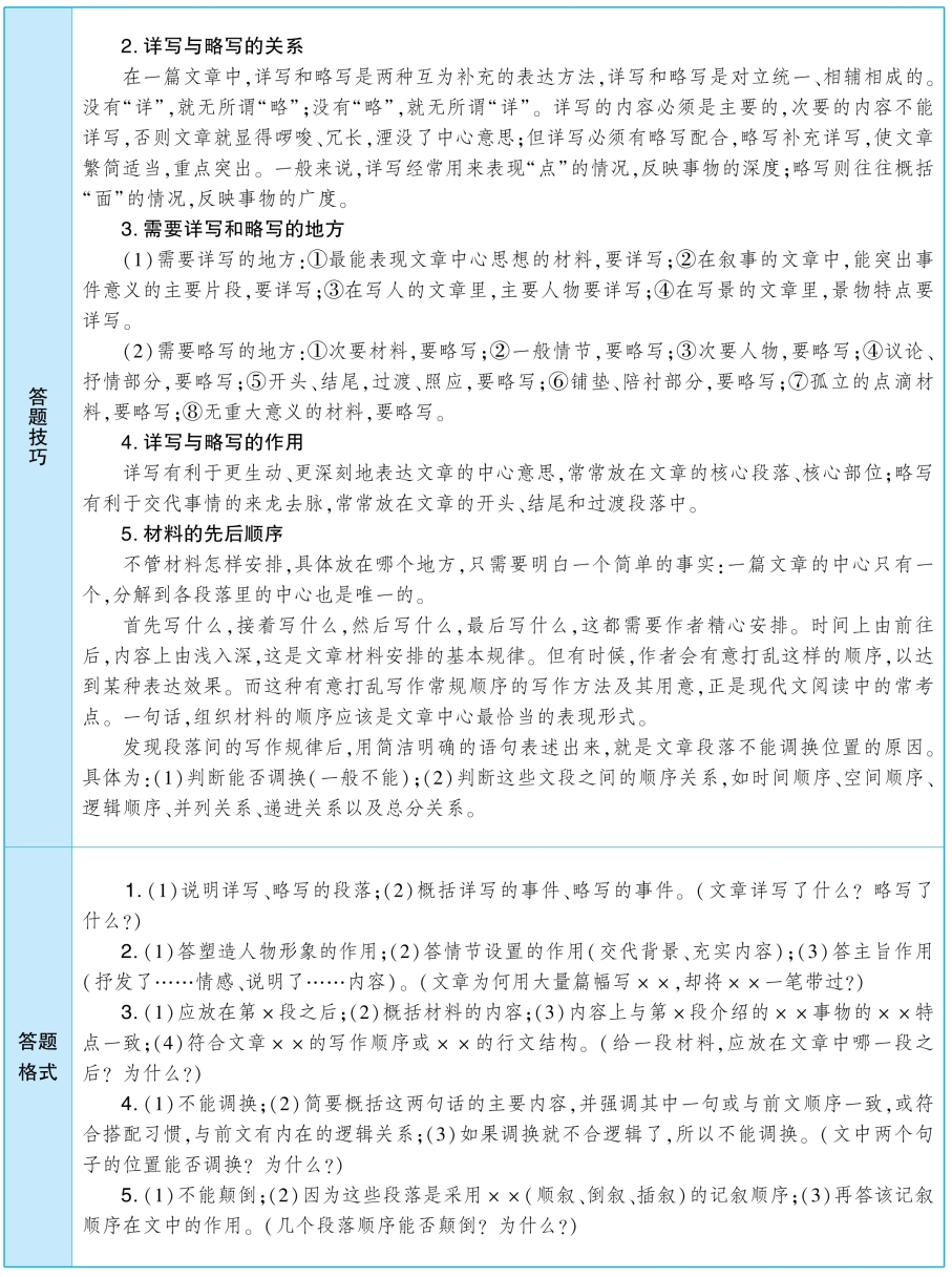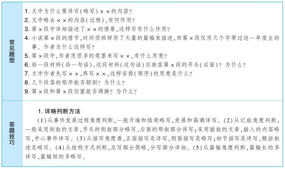 详写,指用较多的笔墨和篇幅对与文章主题密切相关的材料进行细写。略写,指用少量的文字对与文章主题不太密切的次要材料进行粗写。详写能使文章中心突出,略写则能起到交代背景、作铺垫等作用。