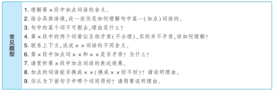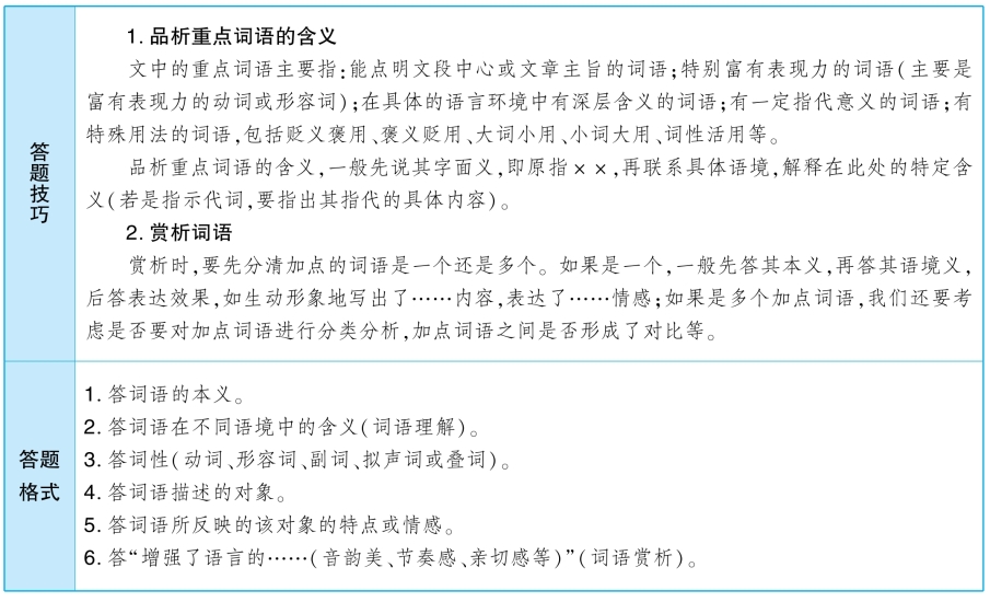 理解词语的含义,主要是指理解词语的比喻义、象征义或者语境义。答题时,首先,要理解词语的本义;其次,联系上下文体会词语的语境义;再次,联系修辞手法分析其比喻义、象征义;最后,把握词语的感情色彩或者作者的情感倾向。词语赏析即对词语表达效果的分析。需要在理解词语含义的基础上,对词语本身的特点进行说明,并对其表达的效果、作用进行分析。