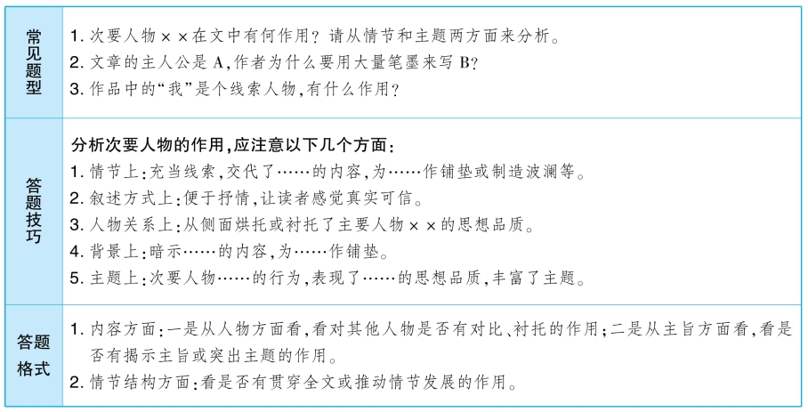 次要人物能够衬托、烘托主人公的形象,突出主人公的性格特点,使主人公的形象更加鲜明,也能推动情节发展或造成情节陡转。线索人物是特殊的次要人物,有衬托、烘托,充当文章线索、揭示主题的作用。