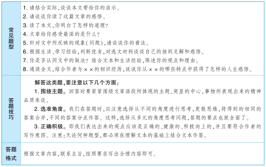 这类考题具有启发性,更容易让考生畅所欲言。这是一种由文本内向文本外拓展延伸的题型,多由小说所写的情节、人物、主题而感,向现实或人生延伸。答题时,应把握人物的精神实质和作品的主题思想,对作品进行个性化阅读和有创意的解读,能结合社会生活写出自己的感悟。