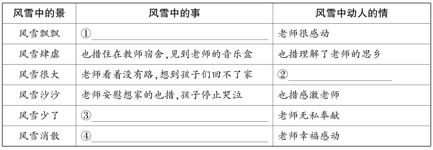 “一切景语皆情语”,请阅读全文后,根据提示填写表格,梳理风雪中动人的事与情。(4分)