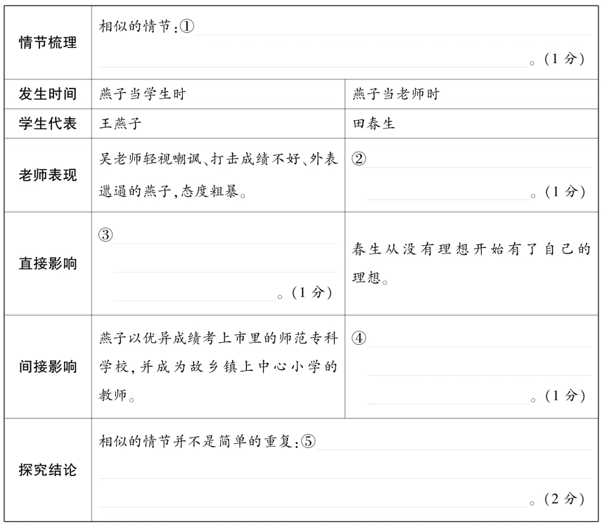 探究一:这篇小说的情节并不复杂,而且里面有两个非常相似的情节。优优把这两个情节进行了比较,但有些地方还没有梳理好,请你和她一起进行梳理。(6分)
