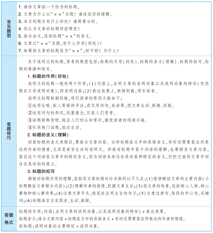 说明文的标题是对全文内容的高度概括,要么准确表明说明文的说明对象,要么引导读者明白文章要描述的“是什么”“怎么样”,或者交代说明对象的特征。要想使说明文的标题新颖别致,就要求标题的语言生动、形象、新颖、有创意。