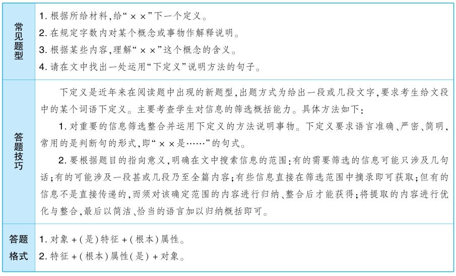 要求我们用高度压缩的语言,揭示出事物最本质的特点。下定义题型,就是结合有关材料,用判断的形式反映对象的本质属性。