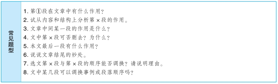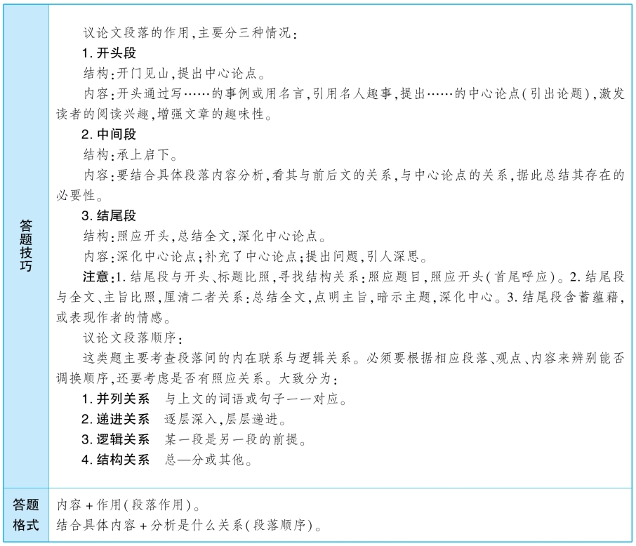 分析议论文中某段落的作用,要审清题干要求:如果题干要求从内容或结构角度答,就按要求的角度作答;如果题干没有要求,就从内容和结构两方面作答。段落顺序主要考查段落间的内在联系与逻辑关系,必须要根据相应段落、观点、内容来辨别能否调换顺序,还要考虑是否有照应关系。