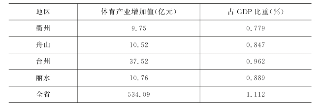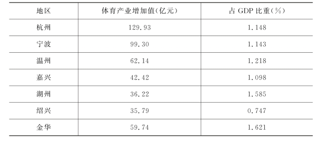 近年来,浙江省投入大量人力、物力、财力,大力发展体育产业,体育产业规模稳步扩大。体育产业总产出和产业增加值占GDP比重逐年增加,由2006年的431.65亿元、0.72%增加到2016年的1682.71亿元、1.11%。其中,体育用品制造性产业依然占大部分比重,而体育健身休闲等服务性产业占比还有待提升(如表2-1所示)。另外,各地体育产业增加值差异较大,金华、湖州、杭州、宁波等城市产业增加值占GDP比重超过全省平均值(如表2-2所示)。