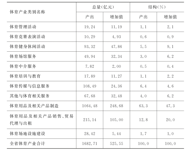 表2-1 2016年浙江体育产业产出和增加值(按体育产业统计分类)