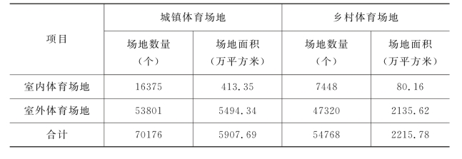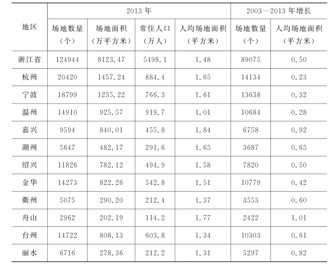 第六次全国体育场地普查和浙江省体育场地普查工作数据显示,截至2013年底,浙江省共有体育场地124944个,用地面积11429.36万平方米,建筑面积1453.79万平方米,场地面积8123.47万平方米。其中室内体育场地23823个,场地面积493.51万平方米;室外体育场地101121个,场地面积7629.96万平方米。2013年末全省常住人口5498万人,平均每万人拥有体育场地22.73 个,人均体育场地面积1.48平方米,全部高于全国平均水平(全国平均万人拥有体育场地12.45个,人均体育场地面积1.46平方米)。全省体育场地在数量上,城乡差距较小,但场地面积差距较大(如表2-3所示),而在地区差异上,杭州市体育场地数量最多,面积最大,但嘉兴市的人均体育场地面积位列第一(如表2-4所示)。