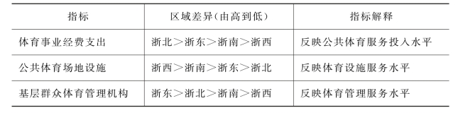 体育公共服务的均衡发展对于城市居民的生活满意度产生重要影响。政府等相关组织对服务体系的均衡性考量能够让居民更好享受体育权利,反映出服务体系建设的良好效果。浙江省在体育事业经费支出、公共体育场地设施等方面存在区域差异(如表2-5所示)。