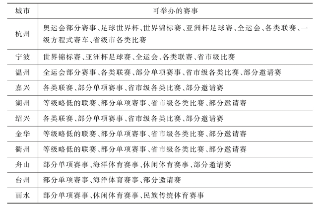 地处长三角的浙江省的体育竞赛业市场主要集中在杭州、宁波这两个经济相对发达的地区,在区域分布上呈现不均衡现象。能够承办大型体育赛事的城市和基础设施建设存在滞后,同时居民的收入水平和消费水平、城市体育文化理念等都会影响体育竞赛表演业的整体发展。浙江省要尽快以杭州、宁波、温州等中心城市为带动,逐渐向周边辐射,形成由点到线,由线到面的体育竞赛表演业市场。浙江省的体育竞赛表演业主要集中在体育竞赛,举办单位以经营性为主、公益性为辅,以营利为目的,通过收取门票和广告为主要形式,包括精英赛、职业联赛等;另外,也包括以公益性为主、营利性为辅,为了提升城市体育文化理念、满足精神文化需求为主的比赛,比如亚洲杯、全运会等。各城市可以根据自身体育设施基础水平、城市发展规划、体育人才储备等实际情况,有选择地举办各类大型体育赛事及竞赛表演(如表2-11所示)。